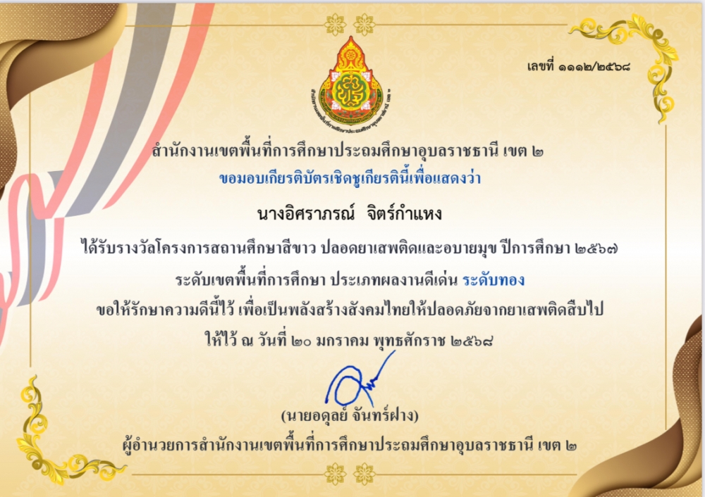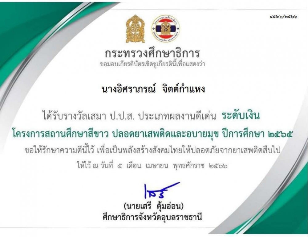รางวัลเสมา ป.ป.ส. ประเภทผลงานดีเด่น ระดับเงิน โครงการสถานศึกษาสีขาว ปลอดยาเสพติดและอบายมุข ปีการศึกษา 2565