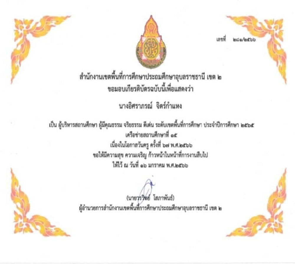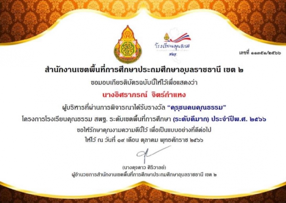 ผู้บริหารสถานศึกษา ผู้มีคุณธรรม จริยธรรม ดีเด่น ระดับเขตพื้นที่การศึกษา
